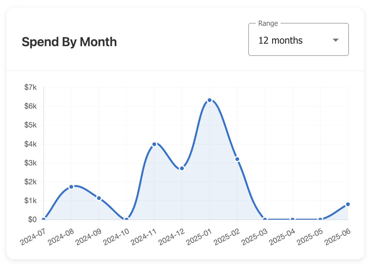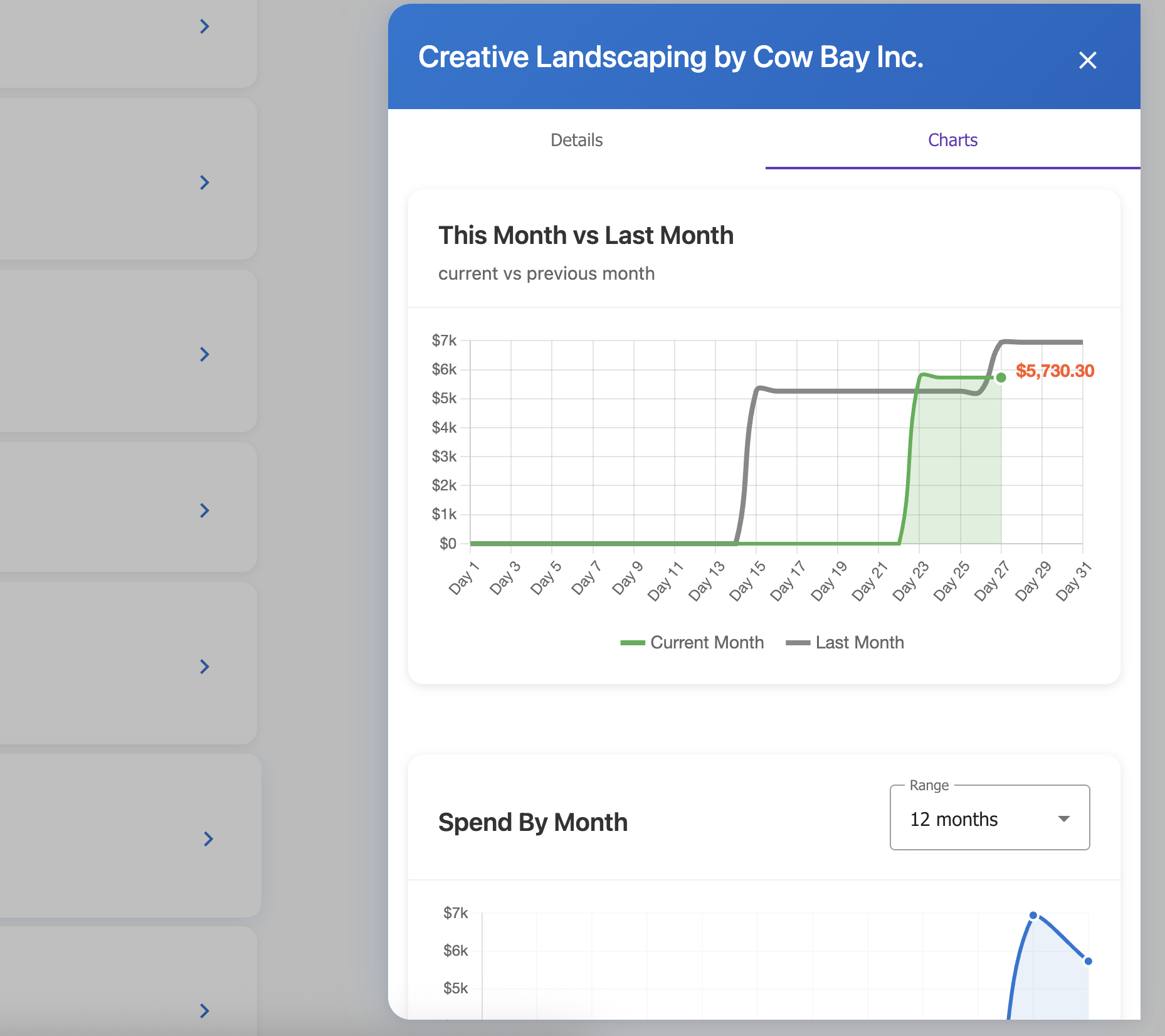 Click the Charts tab in the Vendor Details side panel to see a number of charts that show the Vendor spend over time.