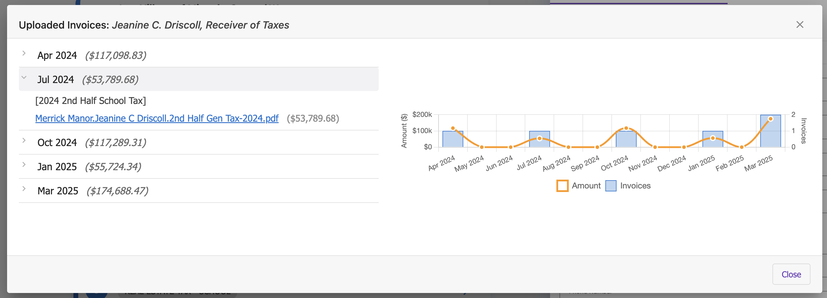 A collapsed monthly view of all invoices uploaded for the Vendor